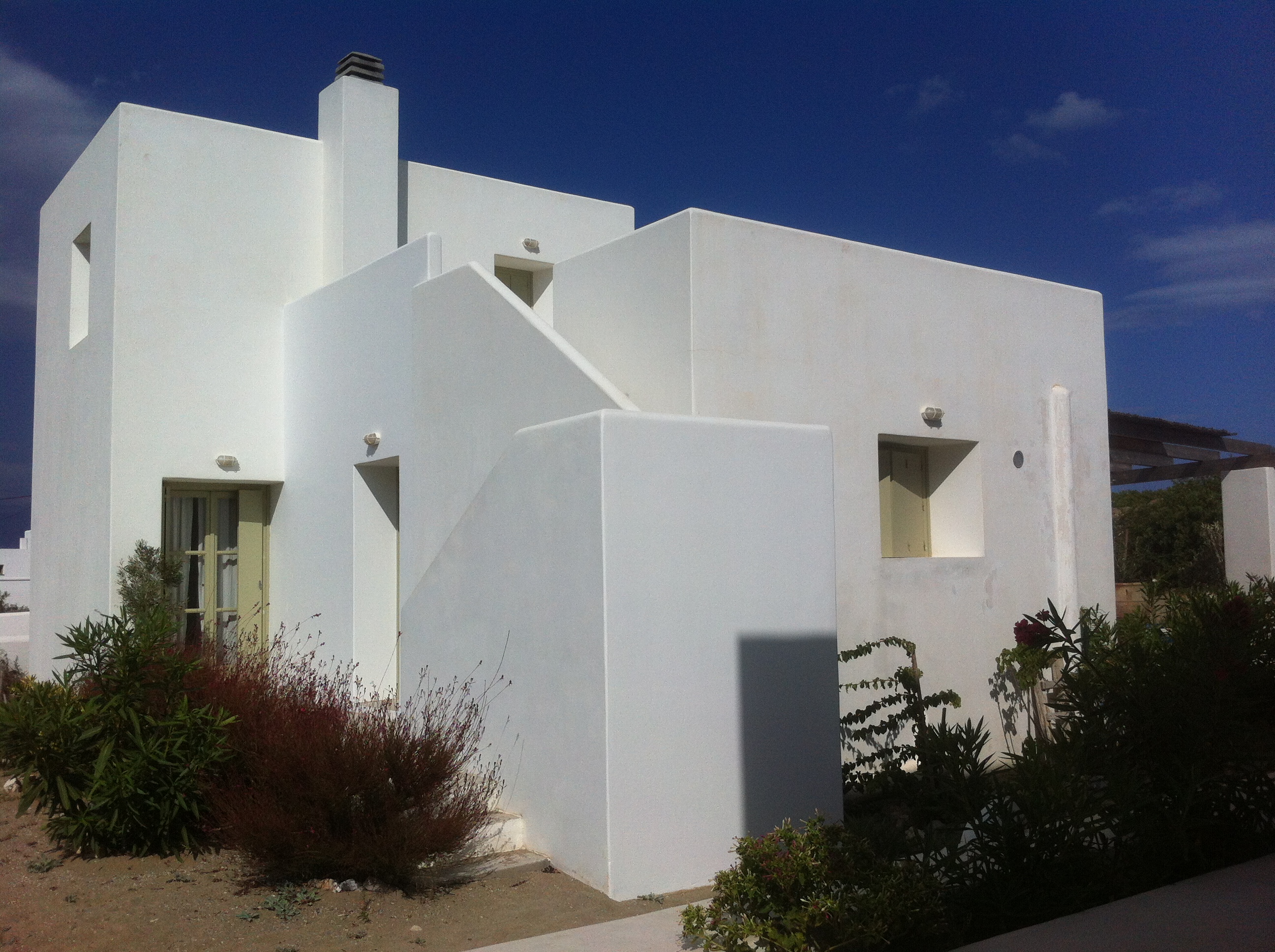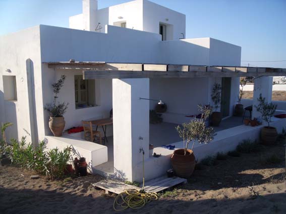 The large ground-floor terrace is protected from public view by a dune, and includes built-in cushioned benches and a dinner table with chairs. The upstairs has a smaller private terrace off the upstairs bedroom and a larger split-level terrace. Both have breathtaking views on the beach, the unique rock formations on the coast, and the Aegean Sea.